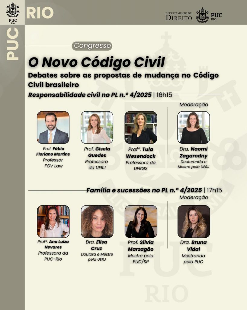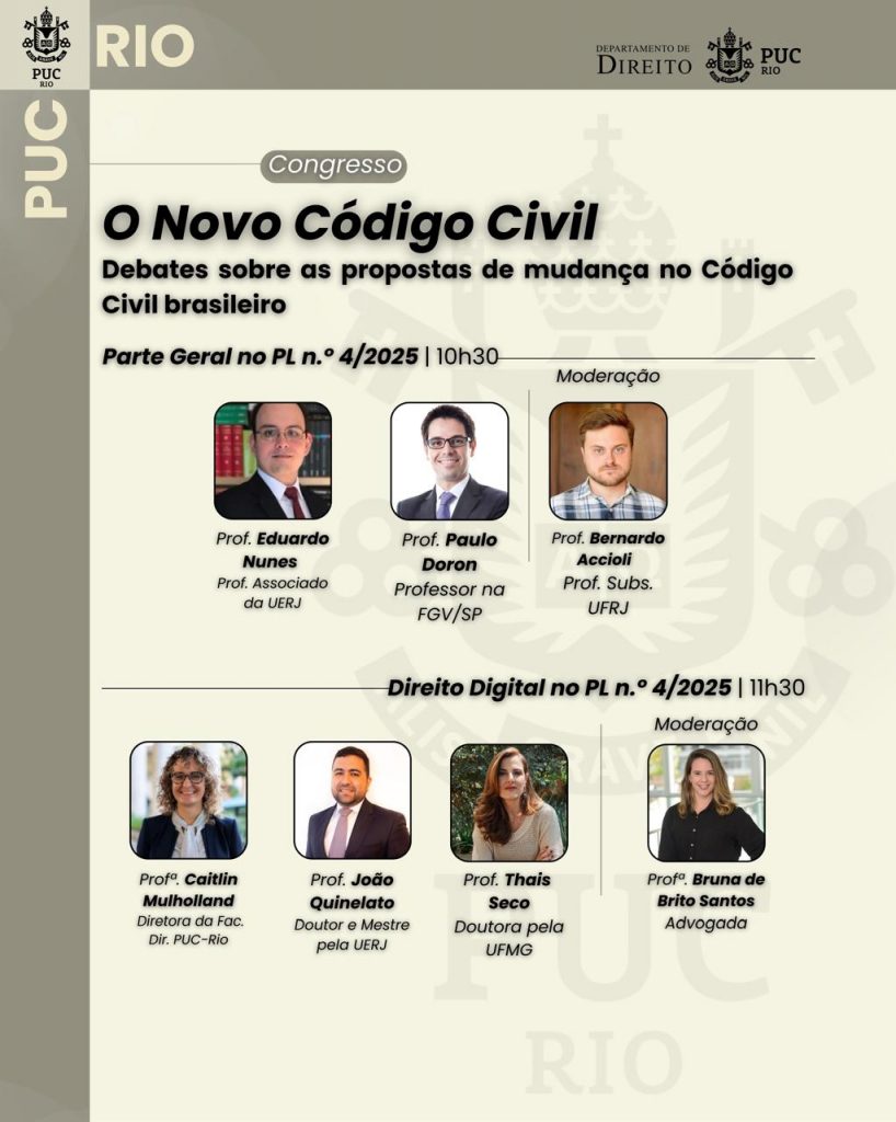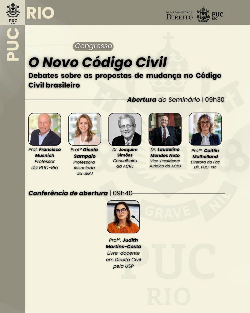 No dia 21/05, quarta-feira, a PUC-Rio sediará evento sobre a reforma do código civil, no B6, iniciando às 9:30. O evento contará com a participação das Professoras Caitlin Mulholland e Ana Luiza Nevares e dos Professores Carlos Konder e Francisco Müssnich. A palestra de abertura será com a Professora Judith Martins-Costa.
